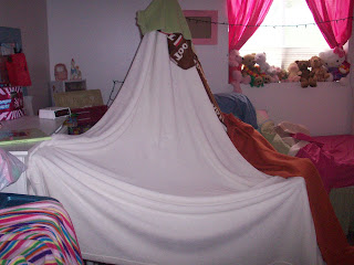 So Swayz had a great idea yesterday, she wanted to build a tent. We started out in the front room but after Michael ran and tore everything down we decided to move our tent into Swayzee's room. It didn't take us long before we had our masterpiece complete. There are several different rooms and a few windows in our tent. We played all day in there and Swayz ended up sleeping in there too.